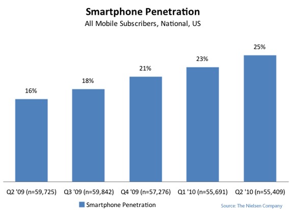 The chart above shows the smartphone segment’s growing share of the overall U.S. mobile phone market. If Nielsen’s predictions are correct, smartphones will begin to outnumber featurephones by the end of 2011.