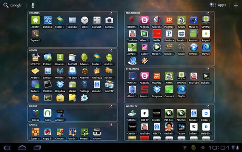 In fact, with the addition of home screen folders, courtesy of Fabio Collini’s awesome Folder Organizer app, or using the folder capability built into the tablet’s mid-2012 Android 4.0 firmware upgrade, you can have your cake and eat it, too, by combining the high density of the Galaxy Tab 10.1 homescreen’s 56-icon home screen layout along with iOS-like app folders.