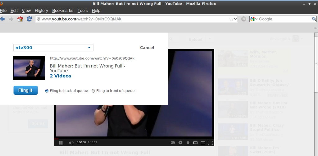 By adding a Flingo bookmarklet to your desktop or mobile PC’s browser, you can “fling” YouTube, Vimeo, and CrunchyRoll videos to a queue in the NTV300’s Flingo channel for watching on your TV. The screenshots below show us flinging videos to the NTV300’s Flingo Queue from Firefox on a PC, and then playing them from the NTV300’s Flingo app…