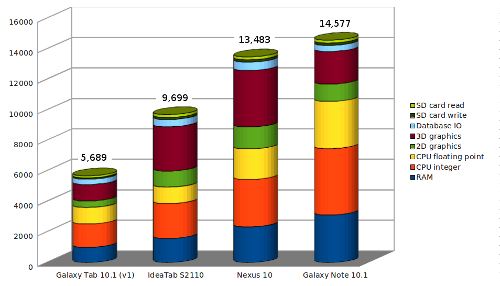 As expected, faster CPU clock rates, more cores, and increased RAM sizes can provide substantially higher performance. From the benchmark perspective, the Galaxy Note 10.1 is the clear winner, with more than twice the score of it’s lower-priced sibling, the Galaxy Tab 10.1.