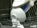 The following Japanese-language video shows the robot carefully picking up, rinsing, and stacking dishes in a dishwasher.