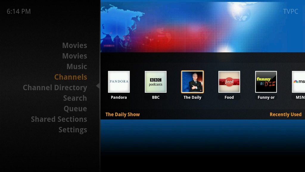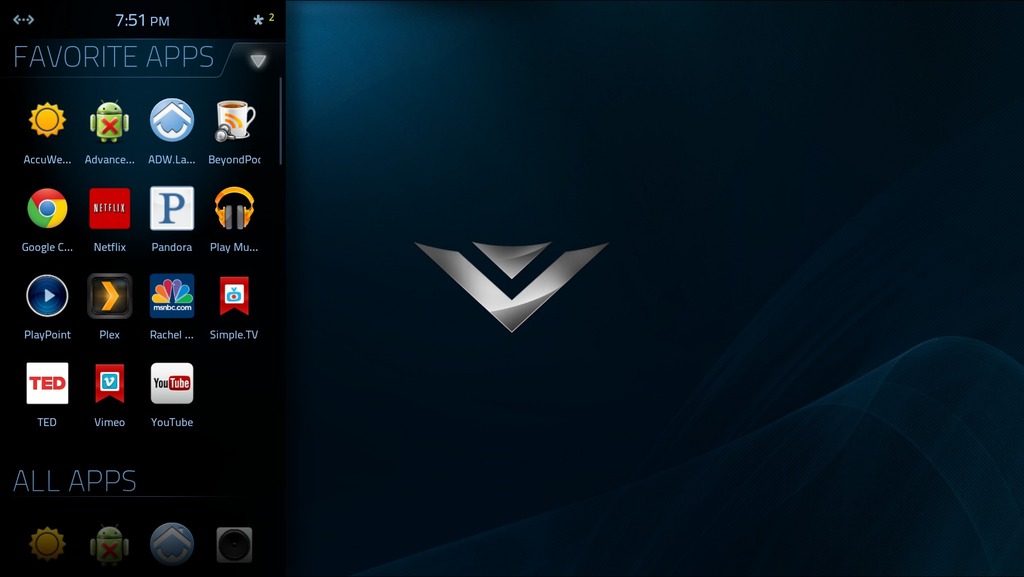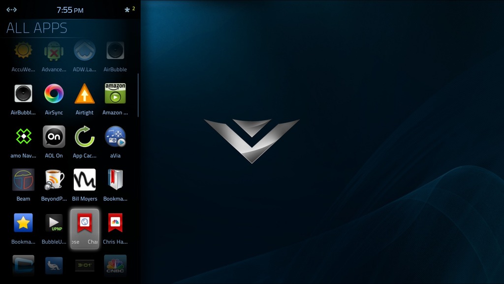 The screenshots below demonstrate the Co-Star’s default user interface (UI) and folder function. The standard UI lets you scan though customizable categories of app-launchers and browser-bookmarks in a panel at the left of the screen, which overlays the currently-running app when you press the “V” button in middle of the remote control.
