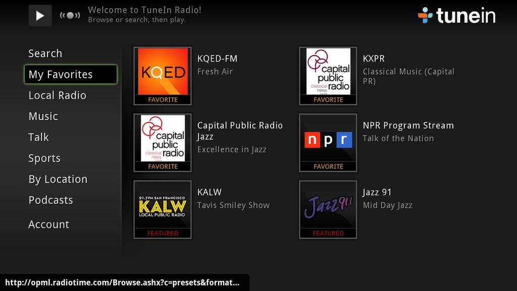 TuneIn Radio lets you stream a wide range of Internet Radio stations to your computers and devices. The service can be used for free, but a modest one-time upgrade to “Tunein Radio Pro” removes some restrictions and advertisements. The standard Android TuneIn Radio app did not function properly on the Co-Star’s Google TV system, so we substituted a browser bookmark with good results, as shown below…