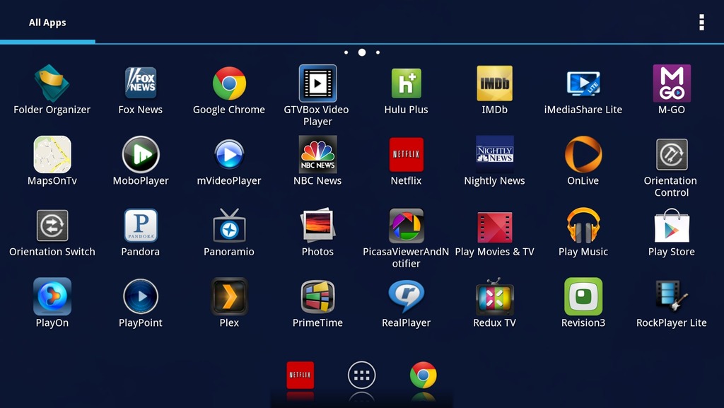 The screenshots in this section demonstrate DeviceGuru’s customized Google TV user interface, after we added and configured several system management apps (the ADW homescreen launcher; the Folder Organizer app; and a screen orientation manager), and changed the homescreen wallpaper to our favorite NASA nebula image.